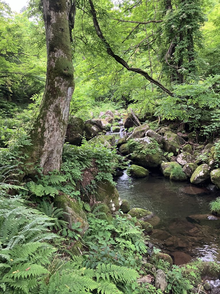 登り始めは川沿いを進みます。6月だというのに気温30℃を超える予報でしたが、この日は曇り予報で、朝早く出発したため、体感温度はそこまで暑く感じませんでした。川風が涼やかで心地よいスタートでした。
