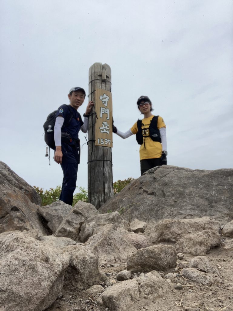 登山開始から4時間、守門岳山頂に到着。我々夫婦の写真はiPhoneのセルフタイマーで撮影しました。休憩とお昼をとり、元気が出てきたので下山を開始しました。